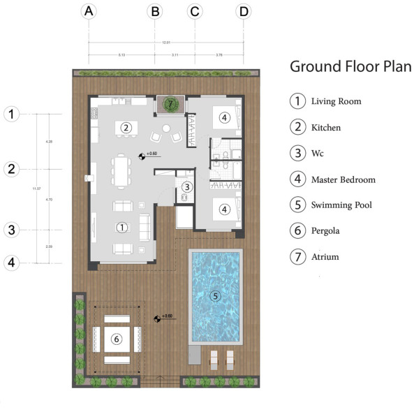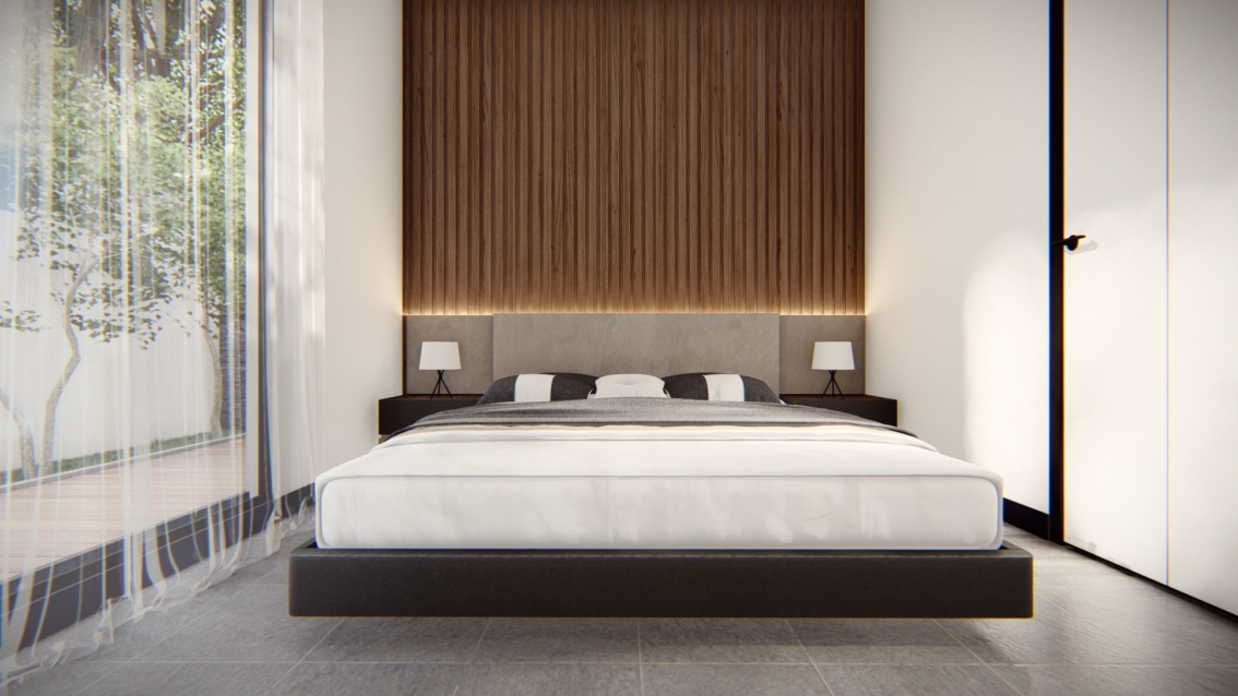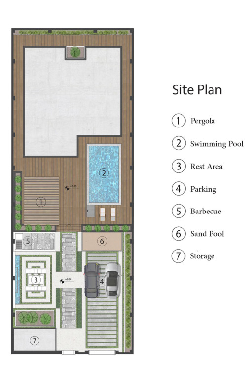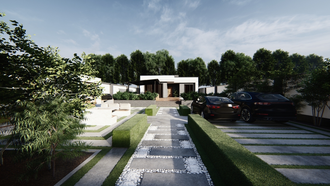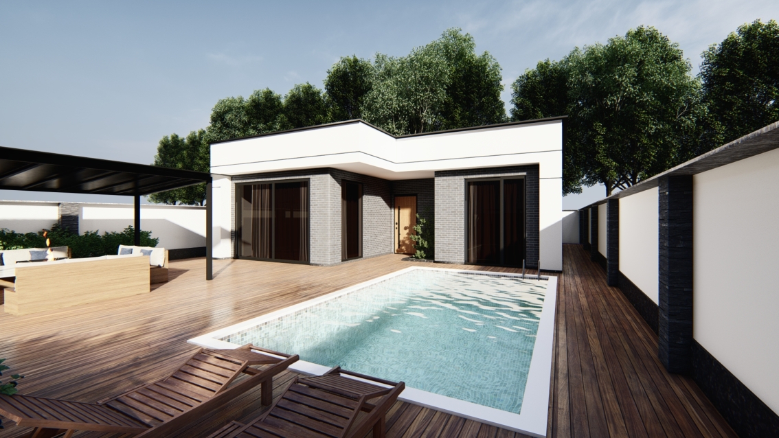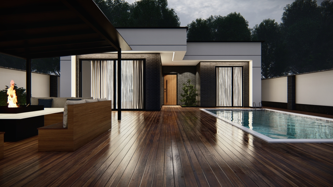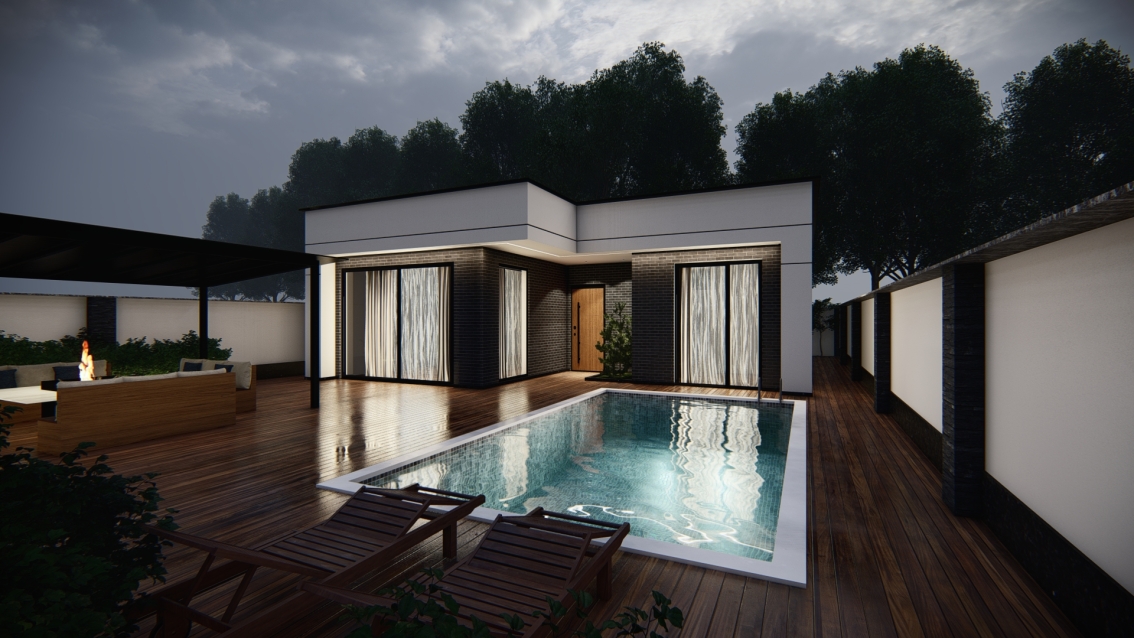 شامل فضاهایی استخر، دو فضای نشیمن (یک نشیمن روباز، باربیکیوی کوچک، جایی برای بازی کودکان و همچنین فضایی به عنوان انباری بود که تمام موارد در طراحی لحاظ گردید.