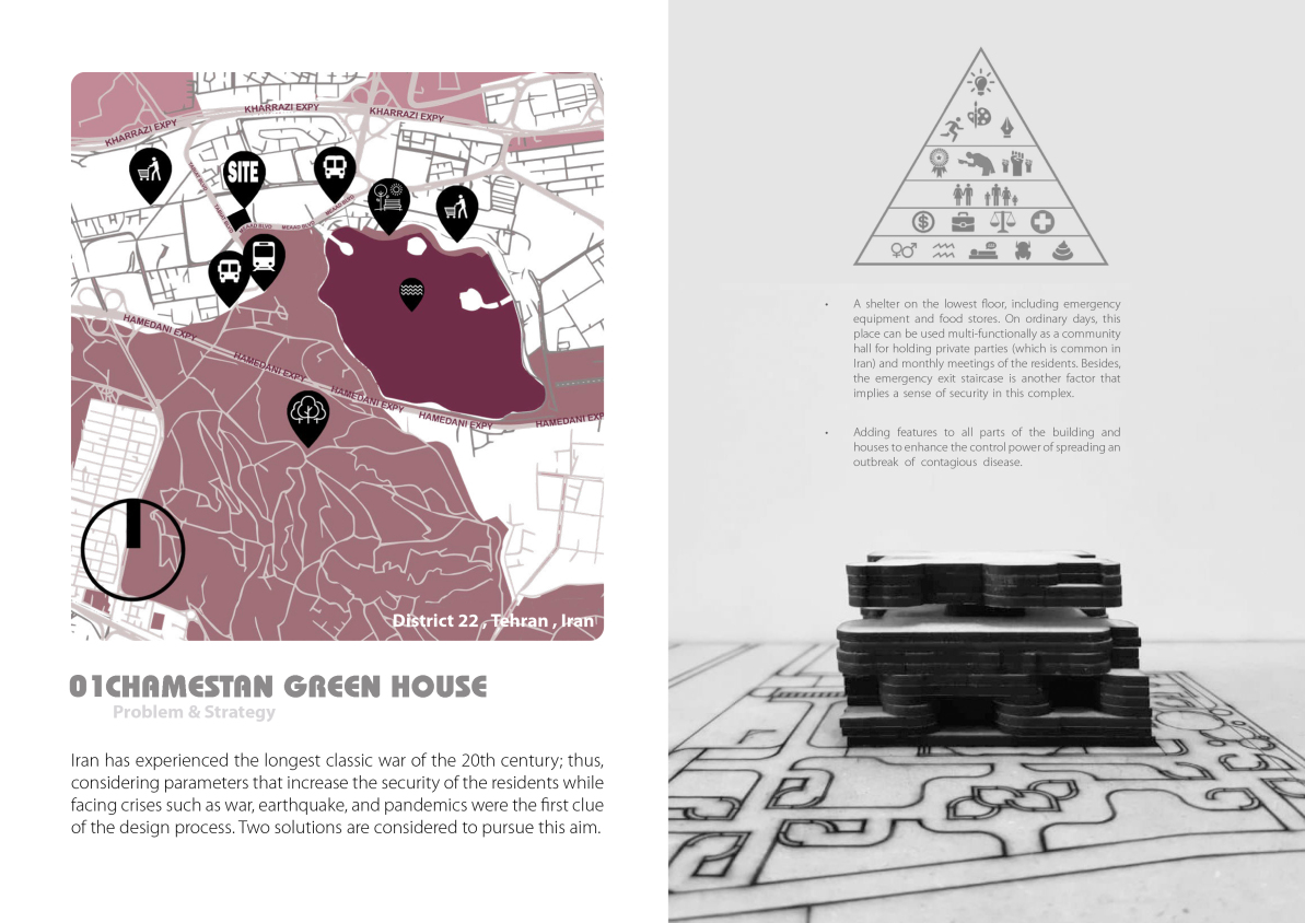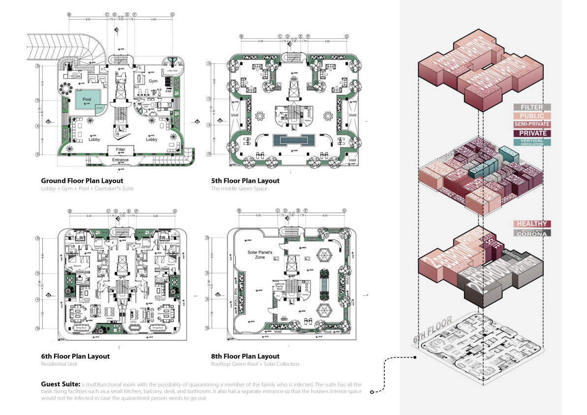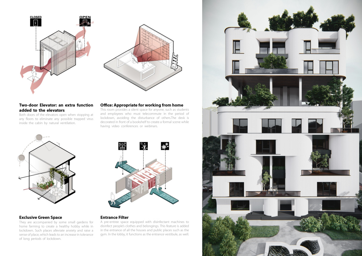 This project is designed to create resilient and adaptable residential spaces capable of responding to emergency conditions such as pandemics, wars, earthquakes, and other crises. Global experiences have shown that most existing housing models are not prepared for such situations, and lockdowns, remote working, and virtual activities have dramatically transformed modern human life. The project introduces multi-functional spaces that serve everyday needs while ensuring readiness during emergencies. An underground shelter equipped with emergency supplies and food storage is provided; in ordinary times, this space can function as a community hall for private gatherings or residents’ monthly meetings. In addition, the inclusion of an emergency staircase and features designed to control the spread of contagious diseases reinforce a sense of safety and constant preparedness throughout the complex. Through smart and flexible architectural strategies, this project enhances the quality of life