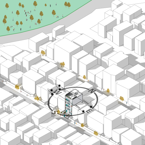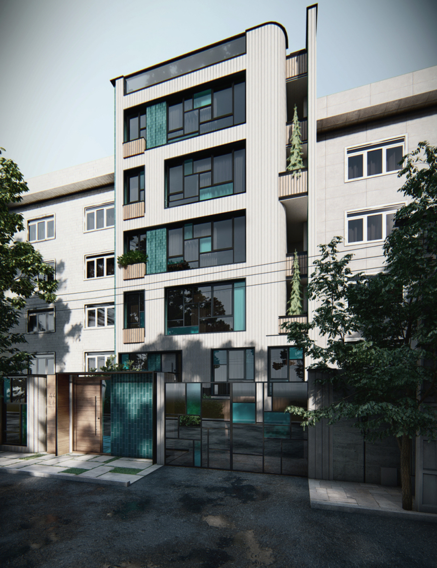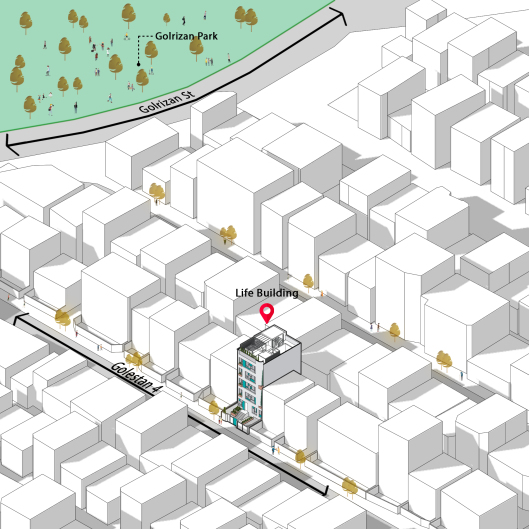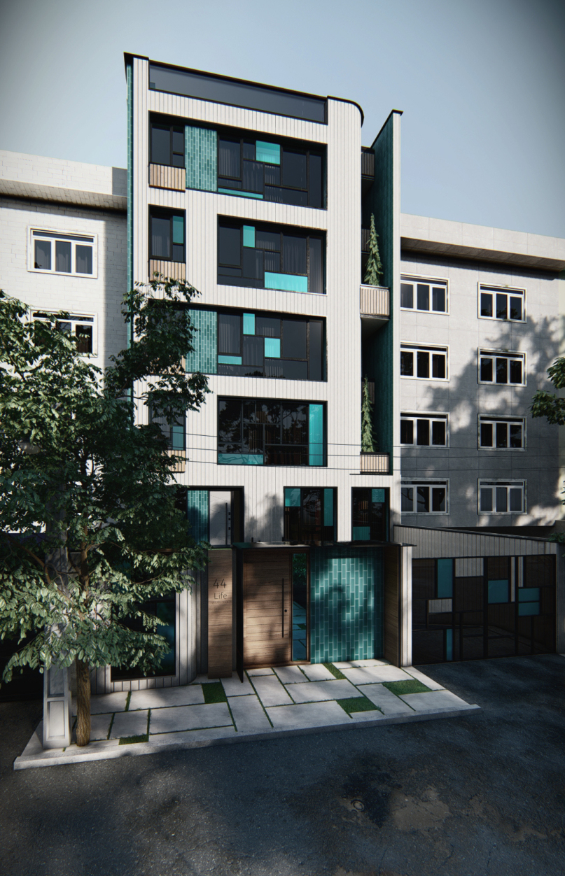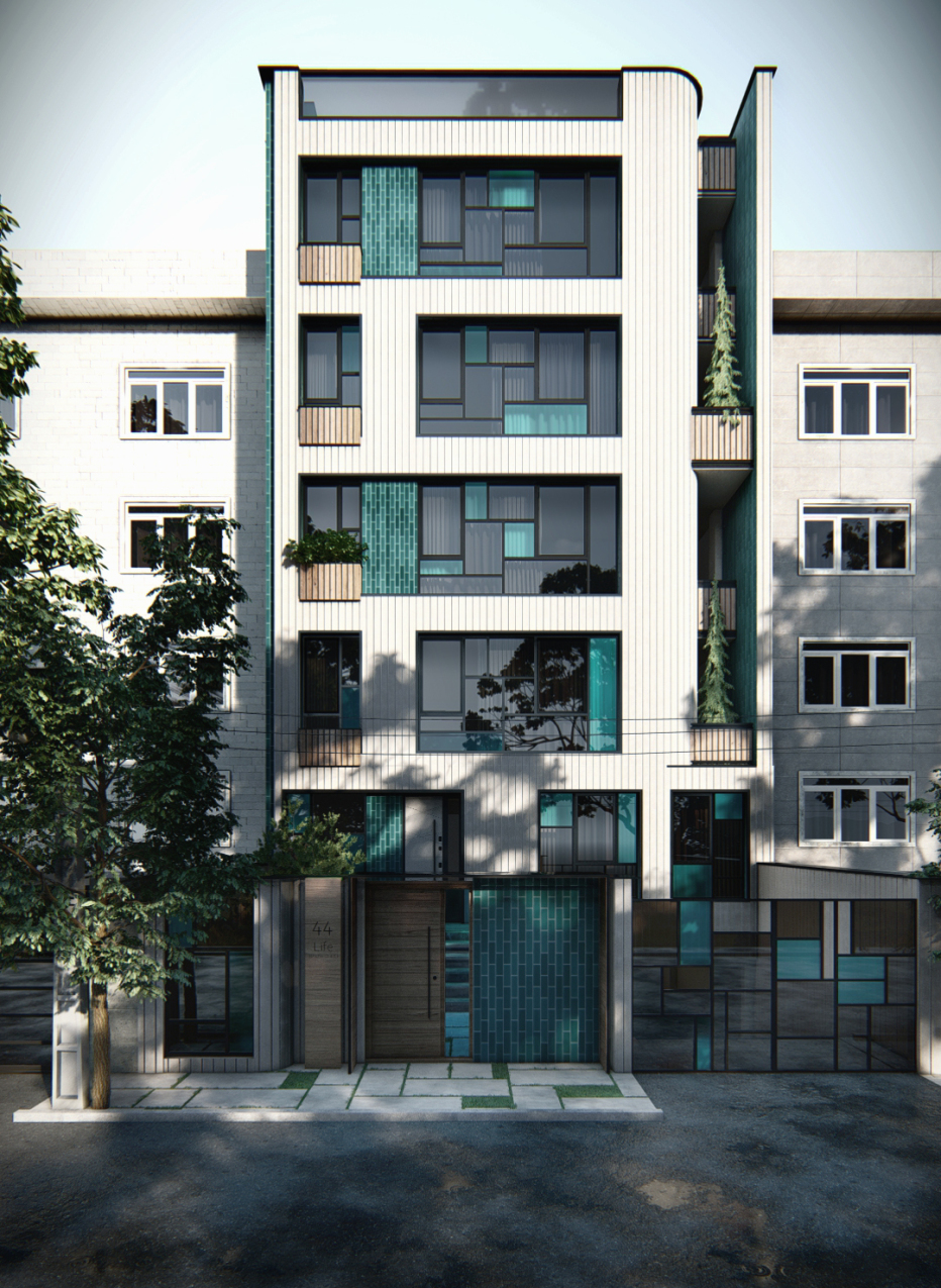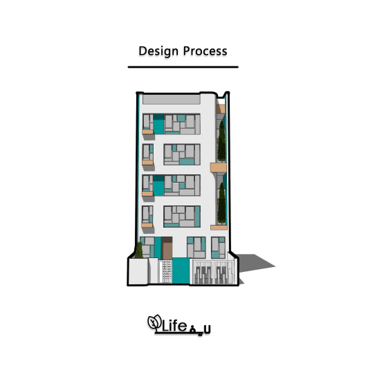 پروژه مسکونی لایف، در محله ولنجک، بلوار دانشجو واقع شده است. باز طراحی فضاهای داخلی و نمای ساختمان در مرحله سفت کاری به دفتر ناوان سپرده شد .در ابتدا، نگاه غالب به طراحی اولیه پروژه از سبک متداول معماری کلاسیک و نمای رومی تبعیت می کرد؛ لذا از آن جایی که چنین سبکی هیچ تناسبی با زمینه قرار گیری آن - کشور ایران - نداشته و به سبب تکرار بیش از حد در نماهای شهری در سال های اخیر، نخ نما گردیده، بر آن شدیم که با نیم نگاهی به معماری ایرانی، آن را مطابق سلیقه امروزی و فارغ از پرکاری ها و تزیینات قدیمی، طراحی کنیم. یکی از نکات طراحی، الهام از کمپوزیسیون پیت موندریان، نقاش هلندی معاصر، برای شکل دادن به فریم پنجره ها بود. همچنین، به جای رنگ های غالب نقاشی های او نیز، از شیشه های آبی و فیروزه ای به صورت پراکنده استفاده گردید. در نتیجه، این ترکیب، به آیکون اصلی برای طراحی جداره کوچه، کف و... تبدیل شد. مصالح غالب نما، آجر نسوز خاکستری، آجر لعابی فیروزه ای (ملهم از معماری ایرانی)، چوب و شیشه می باشد. از ورود عناصر طبیعی - گلدان های بوته و درخت - نیز برای القای بیشتر حس زندگی به ساختمان استفاده شد