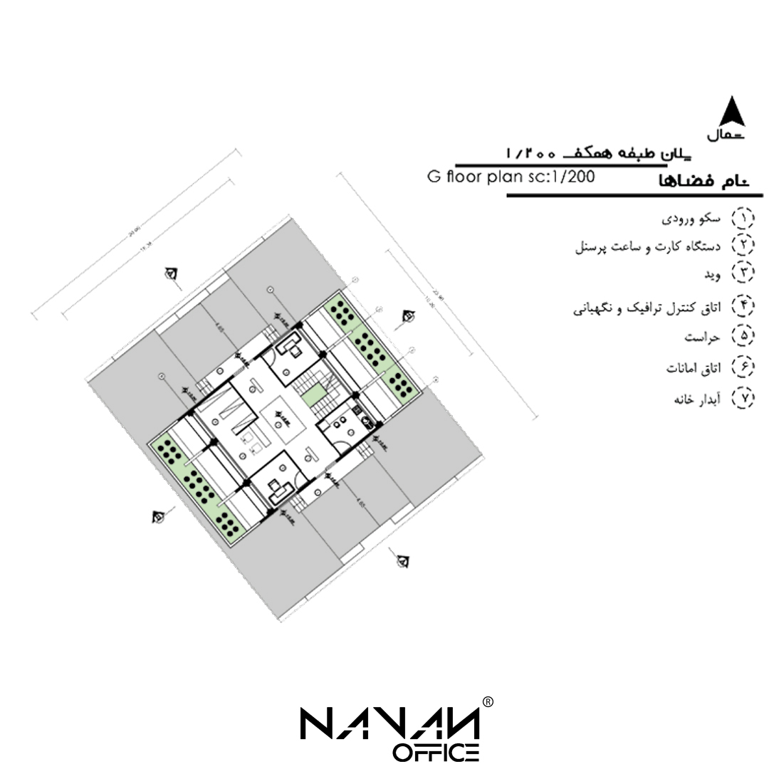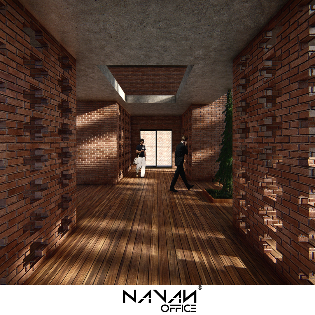 ساختمان مرکزی که یک مکان عمومی بوده به عنوان محلی برای گذر یا توقف موقت افراد شاغل در کارخانه در نظر گرفته شده است اما به دلیل مساحت کم و استفاده حداکثری از فضای موجود برای تامین بخش های مورد نیاز، بر آن شدیم که در طراحی فضای داخلی طبقه همکف، به جای استفاده از دیوارهای صلب و یکپارچه، از دیوارهای مشبک استفاده گردد. این دیوارها علاوه بر افزایش دید افراد حین حضور در داخل و عدم احساس تنگی حاصل از حضور چندین نفر در یک مکان کوچک و افزایش دلبازی فضا ، هم به تهویه کل فضاها باهم کمک شایانی میکند (به طوری که هر اتاق به یک سیستم تهویه جداگانه نیاز ندارد و یک سیستم مرکزی برای همه فضاها فعال است) و هم این افزایش دید خطری برای حفظ محرمیت فضاها ایجاد نمی کند چرا که کاربری های موجود عملا نیاز جدی به حفظ محرمیت و دید تا این حد ندارند و این افزایش زاویه دید خللی در کار کسی وارد نمی سازد.