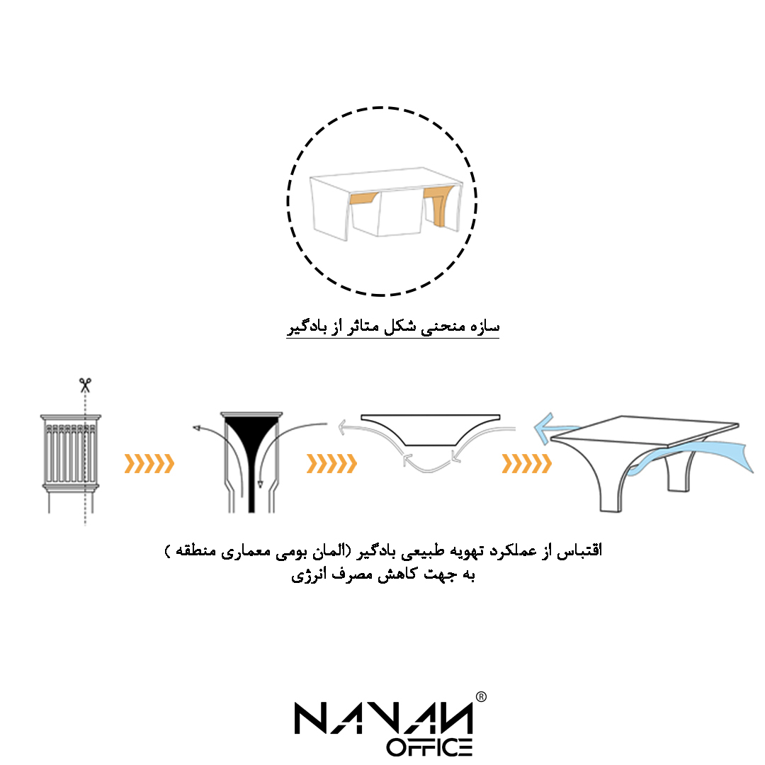 عامل اصلی برای هدایت باد در بادگیرها سازه منحنی شکل داخل آن است و به سبب "اثر دودکشی" هوای گرم داخل ساختمان از سمت دیگر بادگیر خارج می گردد. این ساختار منحنی شکل بادگیر، علاوه بر این عملکرد، به سرنخ بعدی طراحی فرم ما نیز بدل شد بدین ترتیب که فرم کلی طرح، از ترکیب سه عنصر ساختمان مرکزی، سازه منحنی شکل متاثر از بادگیر و پوشش نهایی (سقف مسطح) پدید آمد.