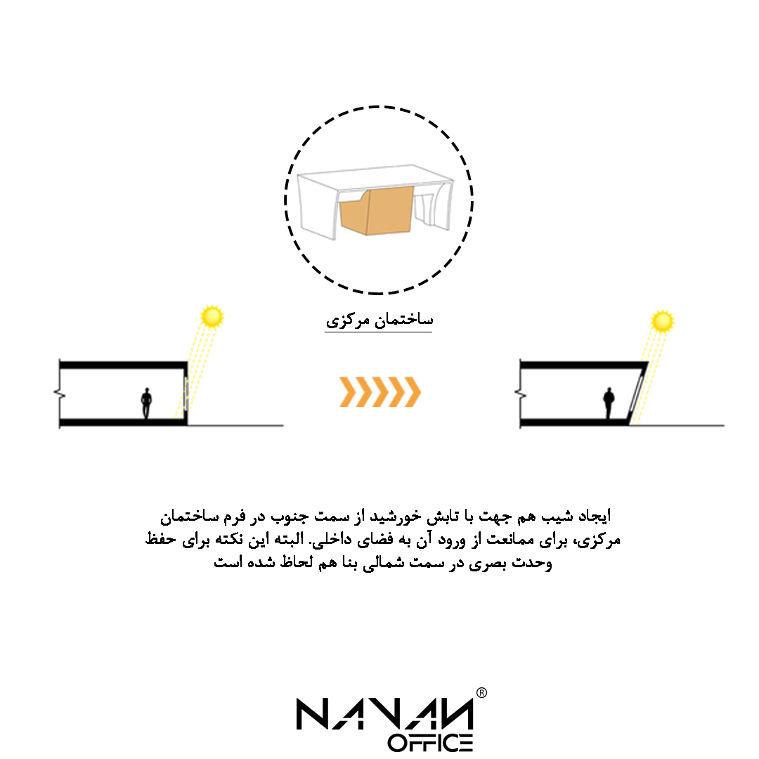 * ایجاد شیب هم جهت با تابش خورشید از سمت جنوب در فرم ساختمان مرکزی، برای ممانعت از ورود آن به فضای داخلی. (البته این نکته برای حفظ وحدت بصری در سمت شمالی بنا هم لحاظ شده است.)