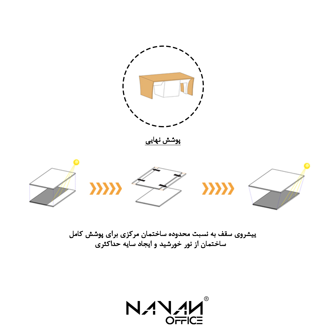 * پیشروی سقف به نسبت محدوده ساختمان مرکزی برای پوشش کامل ساختمان از نور خورشید و ایجاد سایه حداکثری.